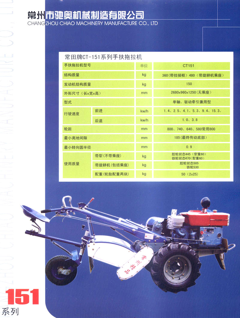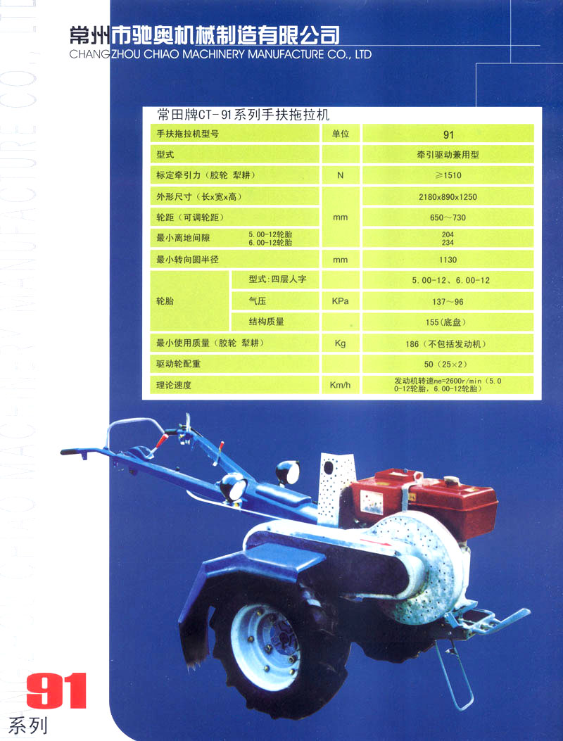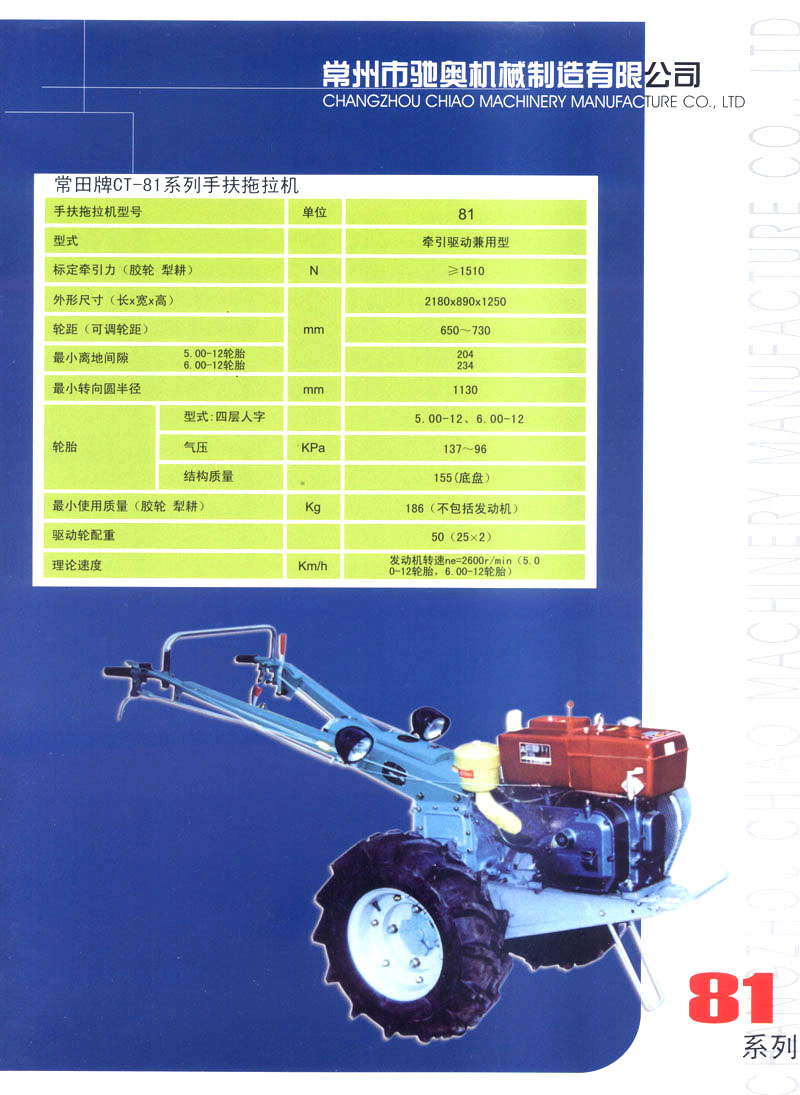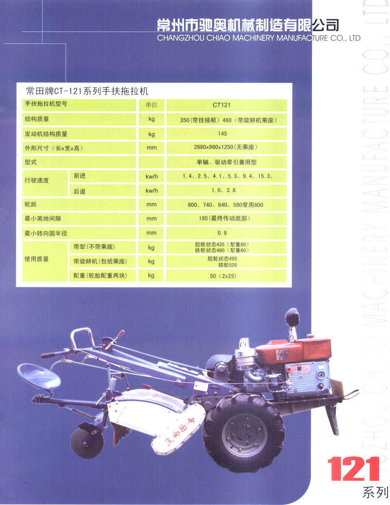 常州市驰奥机械制造有限公司是生产手扶拖拉机的专业生产企业,公司位于风景秀丽、人文荟萃的江苏省常州市,紧邻沪宁、宁常高速以及312国道,交通极为便利。公司拥有先进的手扶拖拉机生产线,主要生产81/91,121/151型手扶拖拉机,产品均为国家农机购置补贴产品。